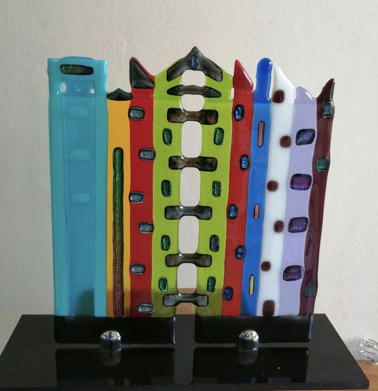 Na een glasfusing workshop was zij zo enthousiast, dat zij samen met zus Tiny diverse cursussen is gaan volgen om zich meer te bekwamen in het werken met glas.
